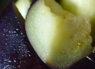 フライパンにたっぷりの玉締めしぼり胡麻油を敷いて、厚切りのおナスを弱火でじっくり焼く。