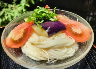 ・素麺にトッピングし、トマトと青ジソを添え、おだしドレッシングで夏らしいメニューに