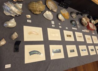 下出先生による螺鈿細工の歴史や工程についてのお話し、粲宙庵に常設展示されている螺鈿の技法を併用した蒔絵の大作についてのお話しなどを拝聴したあと、成田先生による貝の説明が始まる。