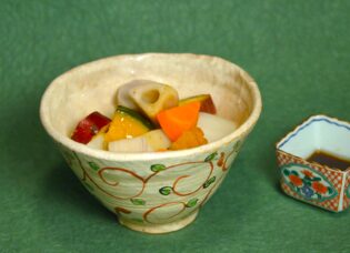 蒸しあがった根菜を小鉢に盛り、お醤油とお酢を好みの割合(同量ぐらいを目安に)で混ぜ、すりおろした生姜とあまに油を加えたドレッシングでいただけば、あっという間に手間いらずの冬のごちそうが出来上がる。