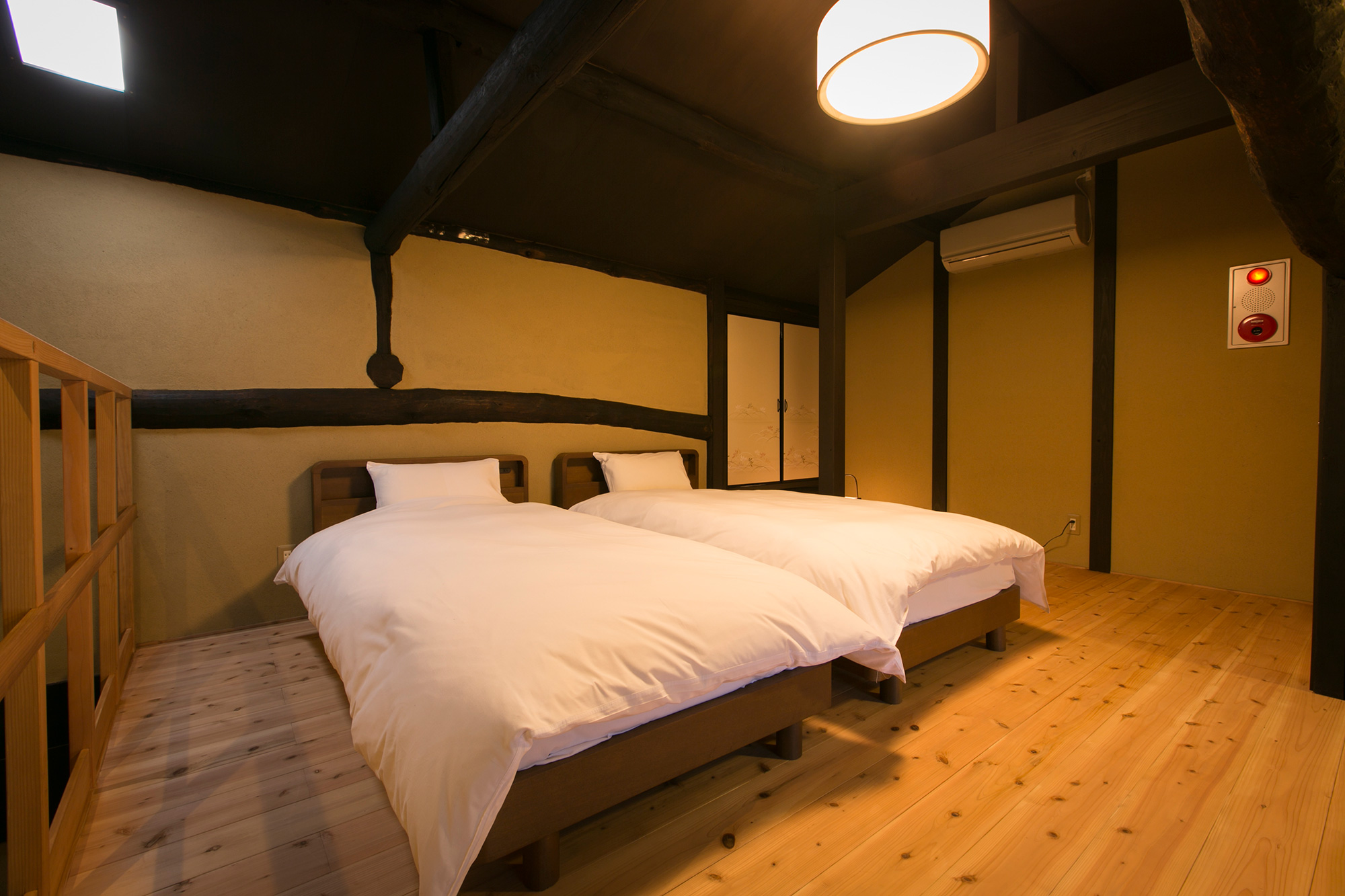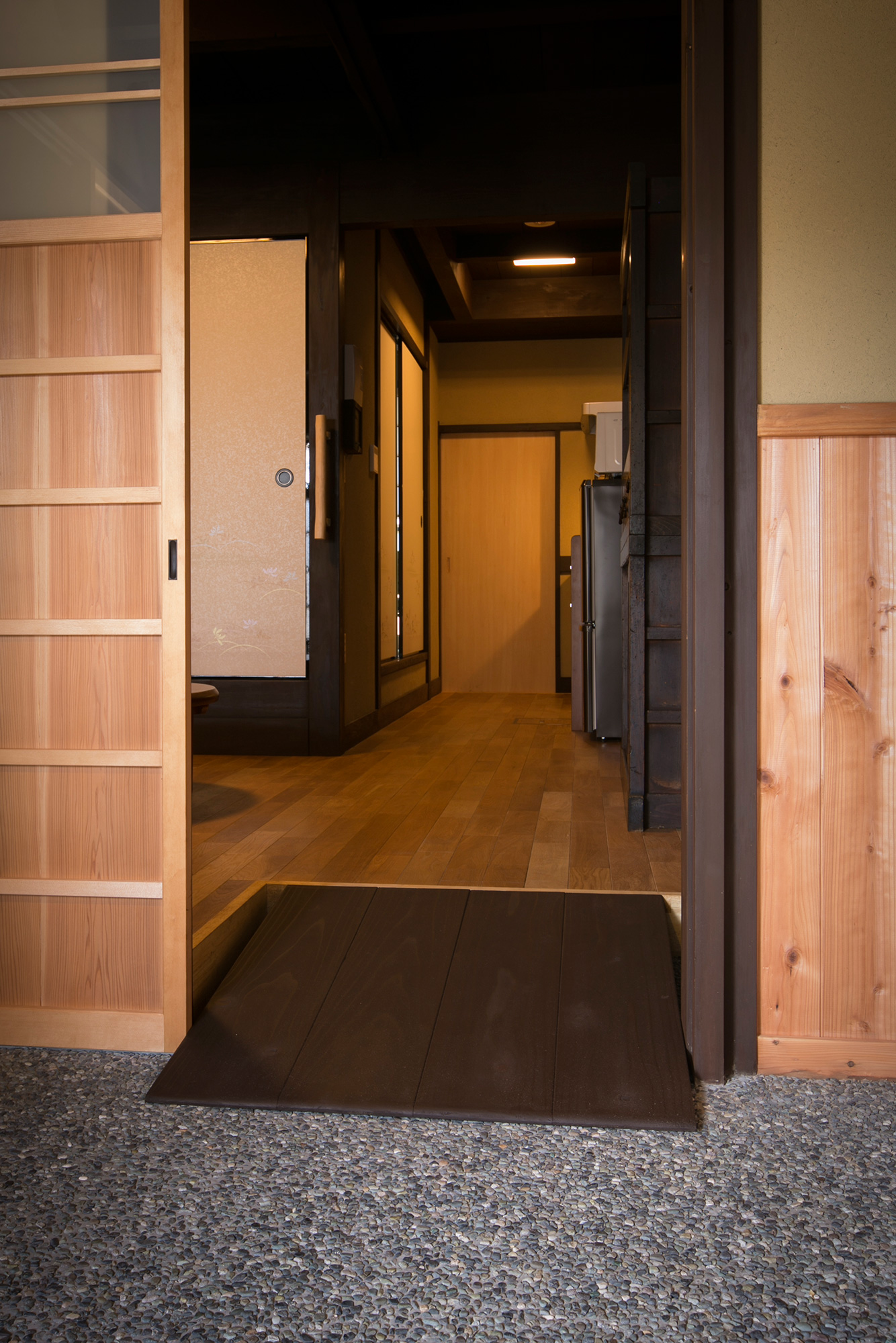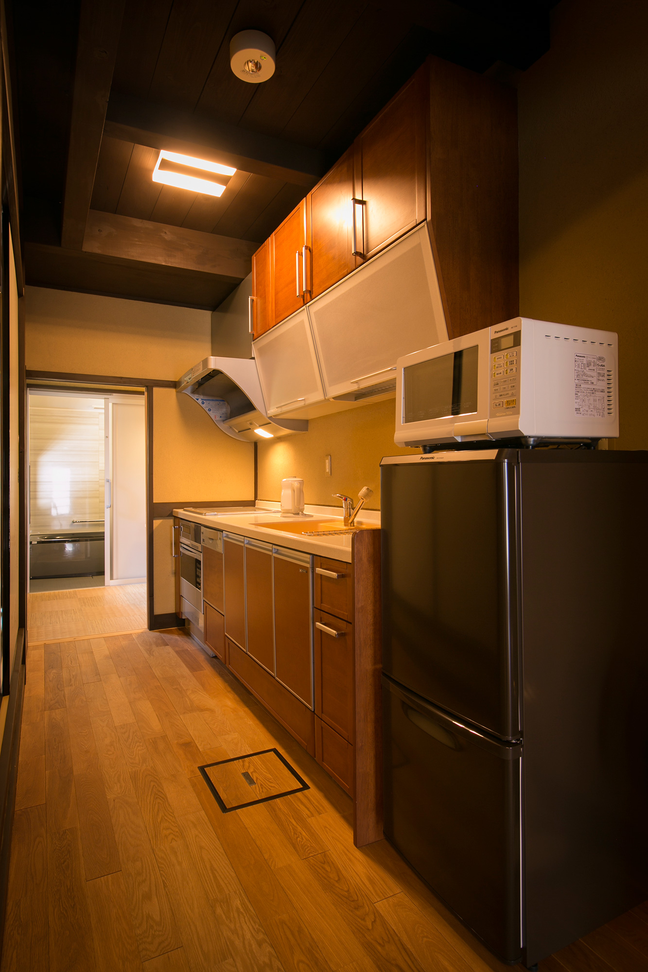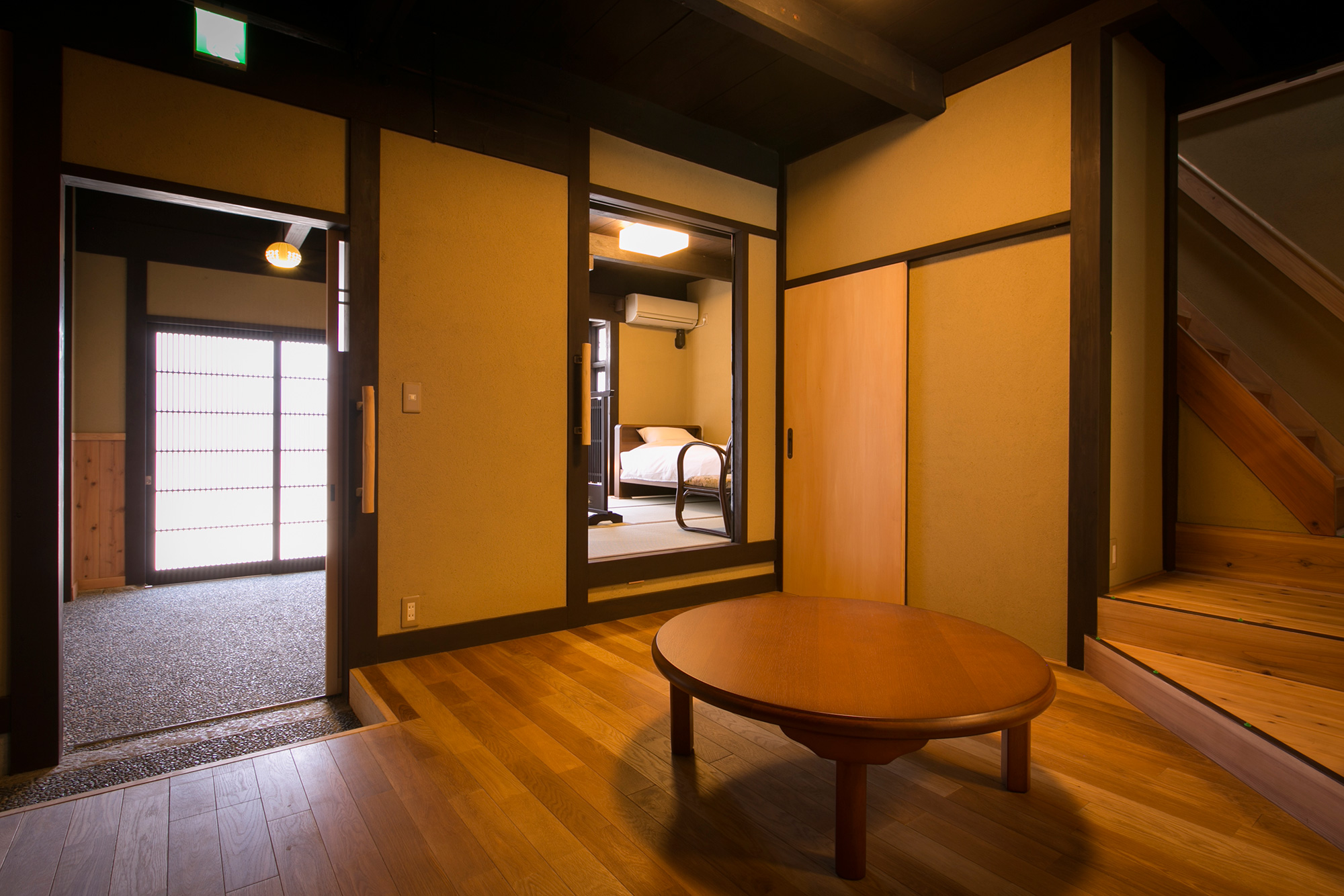 The ramp in the 1st floor is minimized, and the hall way is designed wide for easy access. A bed is provided in the Japanese style room next to the entrance for you to lie down, relax, and relieve the fatigue of the journey.